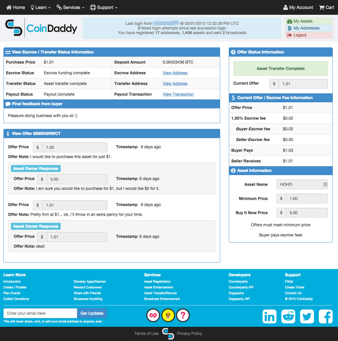 Get StartedDo want to sell ownership of an asset? Perhaps you want to buy an asset that someone already owns? We offer anonymous communications between buyers and sellers to negotiate a price, and an escrow service to hold funds until the transfer is completed!